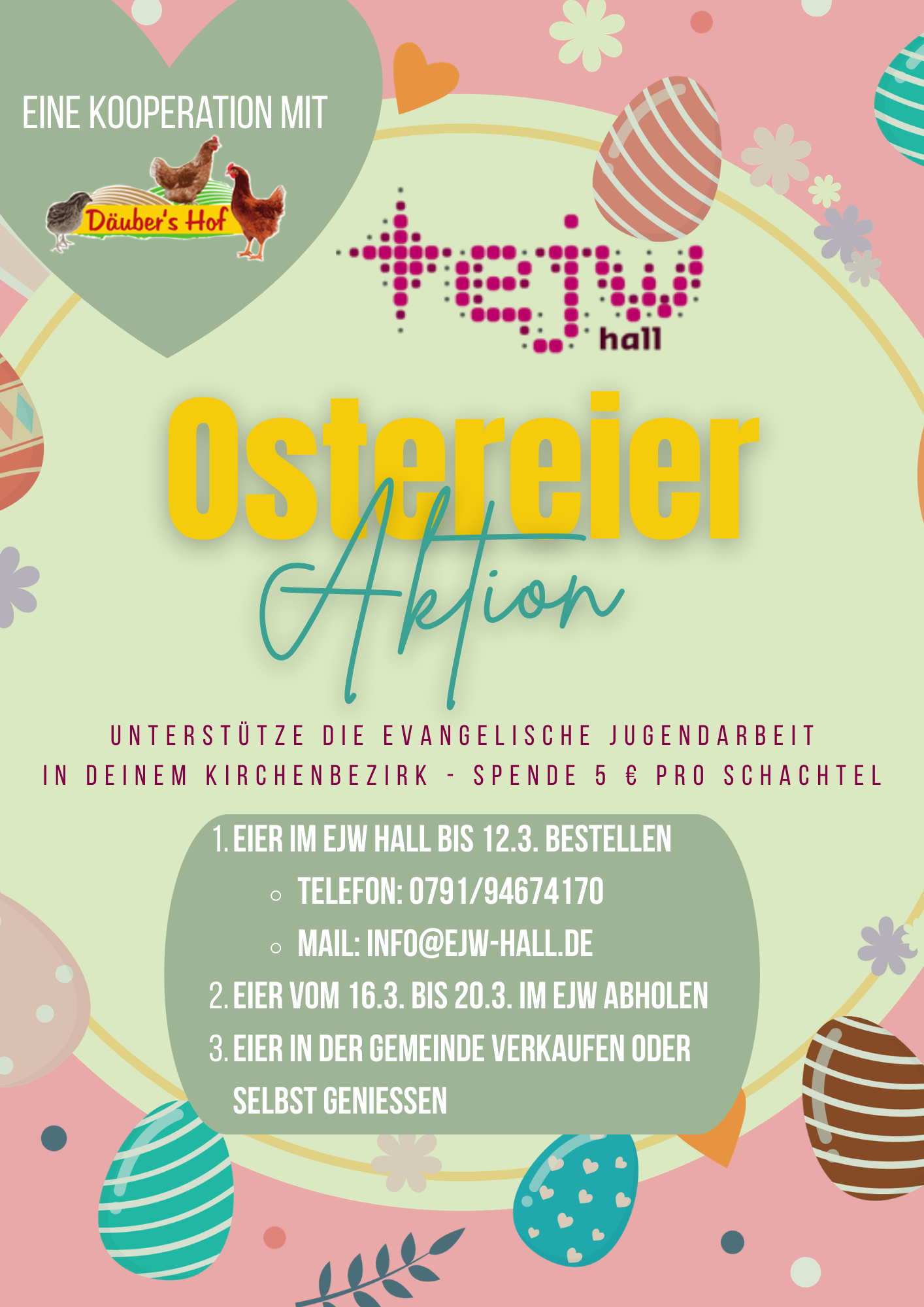 - Bestelle innerhalb des genannten Zeitraums deine gewünschte Anzahl an Ostereier -Schachteln im EJW Hall. Es sind 6 Eier in einer Schachtel.