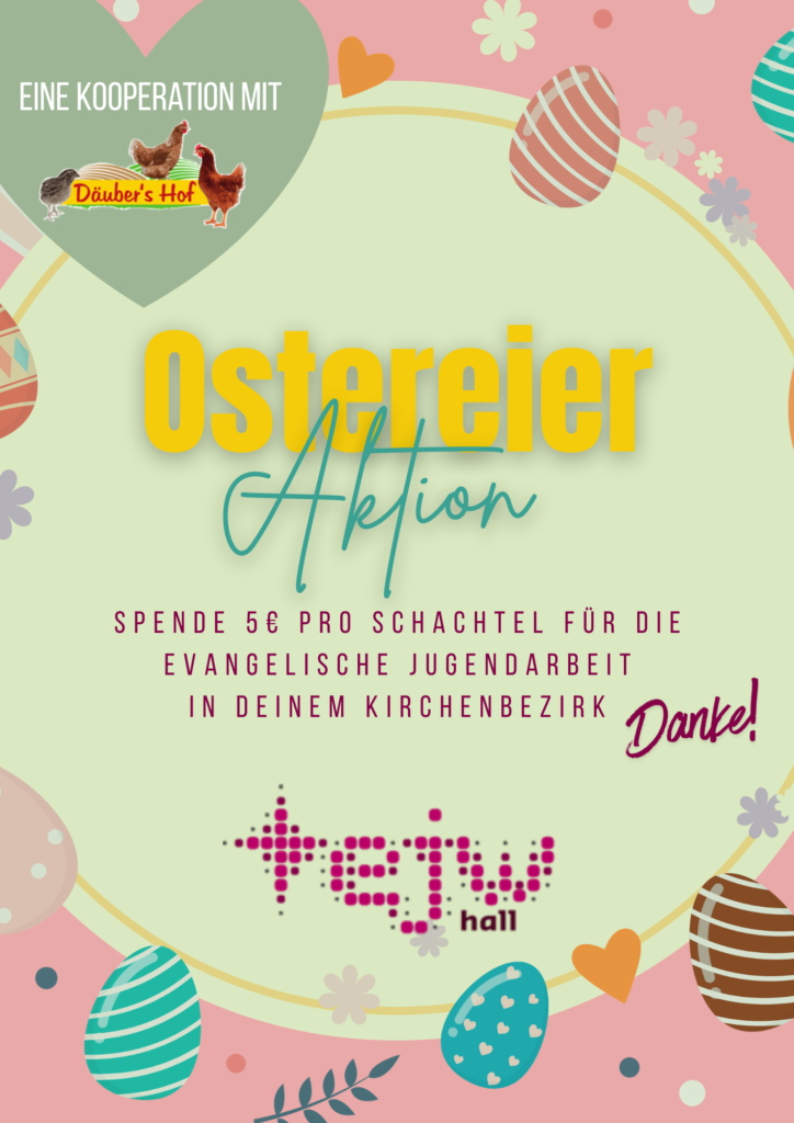 Jedes Jahr in der vorösterlichen Zeit verkaufen wir an Kirchengemeinden oder Einzelpersonen gekochte, bunte Ostereier. Anderen eine Freude machen und immer wieder aufs Neue die frohe Botschaft von Ostern teilen – das ist doch klasse! Mit dem eingenommenen Geld finanzieren wir beispielsweise Anschaffungen, Veranstaltungen sowie eine Jugendreferenten-Stelle.